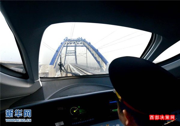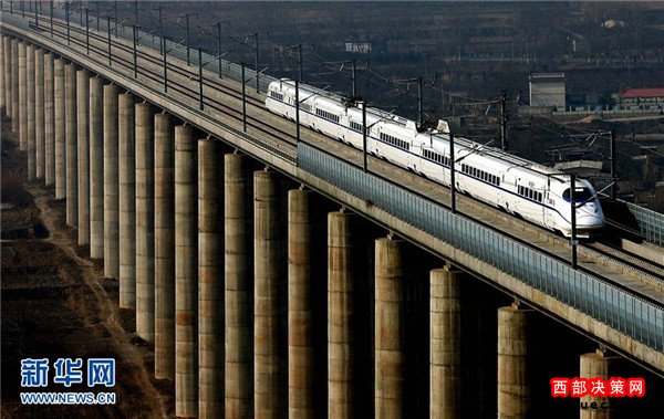 一列試運(yùn)行的動(dòng)車組列車從鄭西高鐵三門峽附近的一座特大型橋梁上駛過(guò)(2010年1月16日攝)。