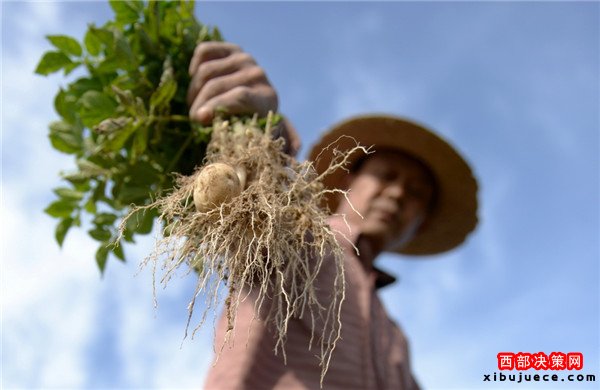 9月28日,在定西市隴西縣德興鄉(xiāng)營(yíng)門村,一位農(nóng)民展示受旱情影響導(dǎo)致不足雞蛋大小的馬鈴薯。