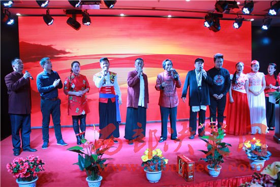隨后,劉美玉大師兄周金品現(xiàn)場一邊寫書法一邊演唱民歌《圪梁梁》,師弟馮小紅獻上陜北說書,李春茹、馮小紅聯(lián)唱《拜年》,嘉賓演唱《走壺口》等為其新歌發(fā)布會和首場演唱會加油打氣。“男子漢從哪里跌倒就在哪里爬起來,這才是陜北男子漢的氣概”,西部歌王王向榮親自登臺為愛徒劉美玉加油打氣,師徒們還聯(lián)唱了《東方紅》,把發(fā)布會氣氛推向高潮。