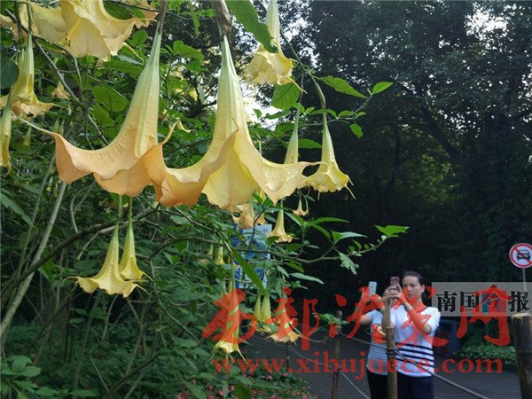 “南瓜花不是長在藤蔓上的嗎,怎么這些‘南瓜花’都倒吊著長在了樹枝上?”昨日,柳州市龍?zhí)豆珗@里的不少游客,都被路旁一種奇異的開花樹木所吸引,紛紛駐足觀賞拍照。記者了解到,那是公園新近引種的木本曼陀羅,因?yàn)閷儆谟卸局参?,市民前往觀賞時(shí),最好眼看手勿動。
