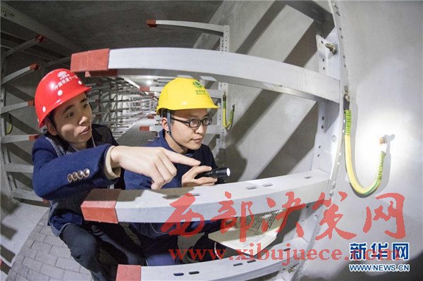 11月24日,解放碑地下環(huán)形電力隧道的一段支線電力隧道內(nèi),兩名國網(wǎng)重慶市區(qū)供電公司的技術(shù)人員(右一、右二)在對預留的商業(yè)用戶接入隧道的電力設施設備進行竣工驗收。當日,經(jīng)過3年多的緊張建設,重慶地下環(huán)形“電力高速路”——解放碑地下環(huán)形電力隧道工程順利通過竣工驗收,并正式投入運行。解放碑環(huán)形電力隧道總長2408米,其中1198米的干線電力隧道已經(jīng)成功接入解放碑商圈及周邊地區(qū)的4個110千伏變電站形成環(huán)線,支線電力隧道1210米也開始陸續(xù)接入用戶。據(jù)介紹,作為重慶市重點工程,2013年7月開工建設的解放碑地下環(huán)形電力隧道按照滿足未來20年電力需求設計,隧道高2.8米、寬2.4米,投入運行后將解決重慶渝中半島和重慶最繁華的解放碑商業(yè)區(qū)配電設施老化、無法擴建等問題,使解放碑商圈供電負荷承載能力得到極大加強。
