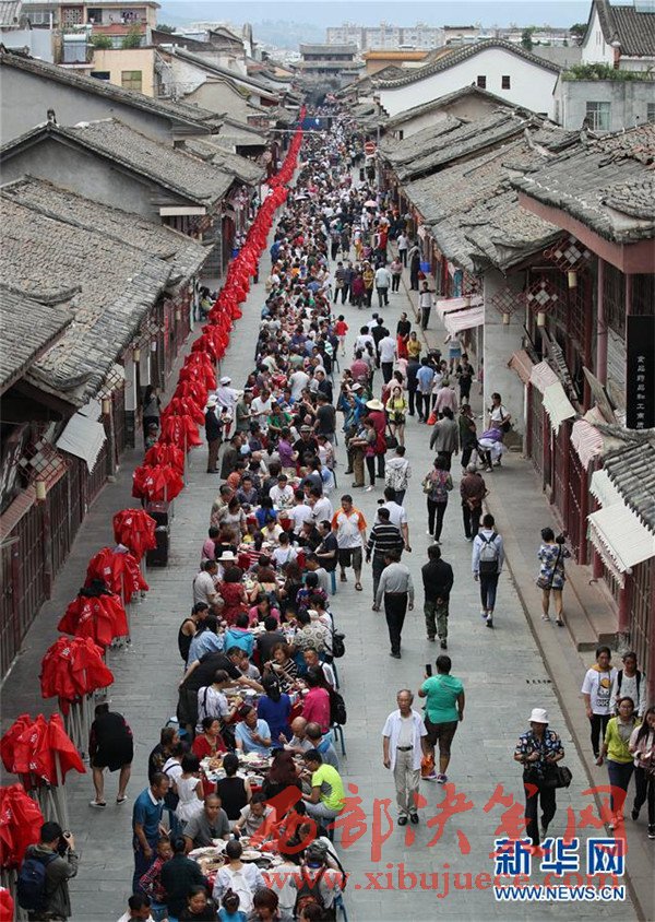 當(dāng)日是端午節(jié),四川省涼山彝族自治州會(huì)理縣會(huì)理古城舉行“萬(wàn)人藥根宴”,約1.5萬(wàn)人共同在古城內(nèi)1500張桌上就餐。