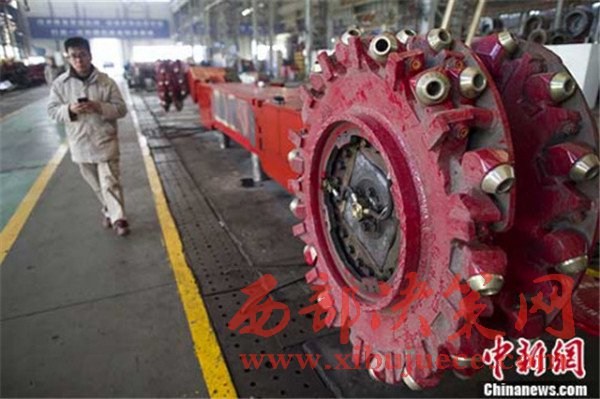 圖為山西太重工人從采煤機前經過。