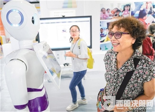 在首屆中國北京國際語言文化博覽會(huì)上,一名參觀者與智能客服機(jī)器人交流。 (