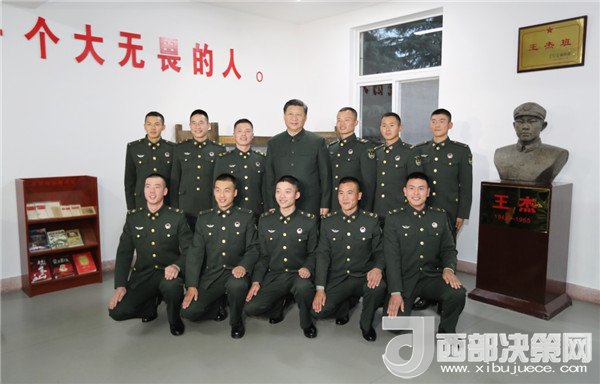 離開(kāi)連隊(duì)榮譽(yù)室后,習(xí)近平來(lái)到“王杰班”。全班戰(zhàn)士列隊(duì)歡迎,習(xí)近平微笑著同他們一一握手?,F(xiàn)任班長(zhǎng)王大毛向習(xí)近平介紹了戰(zhàn)士們爭(zhēng)做王杰傳人的情況。50多年來(lái),連隊(duì)每天點(diǎn)名第一個(gè)呼點(diǎn)王杰??吹酵踅芫裨谶B隊(duì)得到很好傳承,看到尊崇英雄、學(xué)習(xí)英雄氛圍這么濃厚,習(xí)近平很欣慰。他招呼戰(zhàn)士們圍坐一圈,詳細(xì)詢問(wèn)大家的學(xué)習(xí)、訓(xùn)練、生活情況,勉勵(lì)大家再接再厲,帶頭做新時(shí)代王杰式的好戰(zhàn)士。離開(kāi)連隊(duì)時(shí),習(xí)近平同全連官兵合影留念,指戰(zhàn)員們簇?fù)碇?xí)近平,充滿了幸福和喜悅。全連官兵齊唱連歌“王杰的槍我們扛”,表達(dá)了廣大官兵堅(jiān)決聽(tīng)習(xí)主席的話、自覺(jué)做英雄傳人的堅(jiān)定決心。