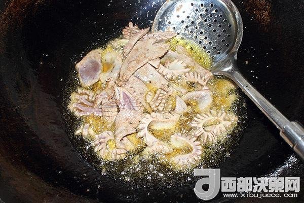 5腰花和肝片用黃酒和淀粉抓勻,等油溫至六成熱時下鍋滑熟撈出