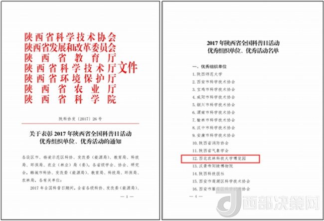 近日,陜西省科協(xié)、省發(fā)改委、省教育廳、省科技廳、省環(huán)保廳、省農(nóng)業(yè)廳和省科學院聯(lián)合發(fā)布了《關于表彰2017年陜西省全國科普日活動優(yōu)秀組織單位、優(yōu)秀活動的通知》,西北農(nóng)林科技大學博覽園獲評2017年全國科普日活動優(yōu)秀組織單位。