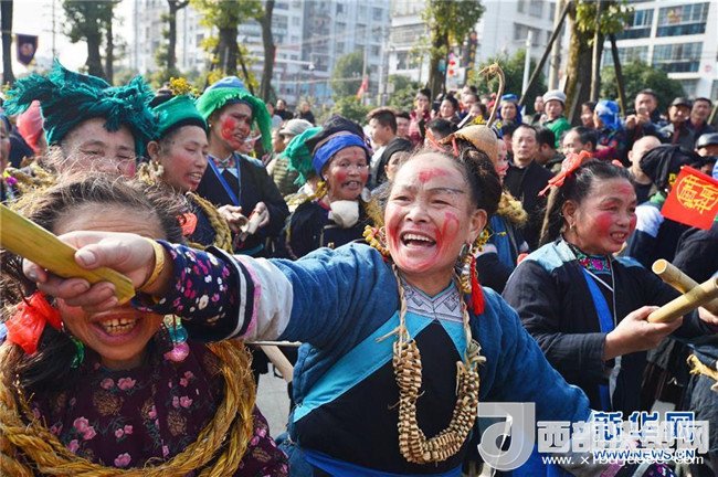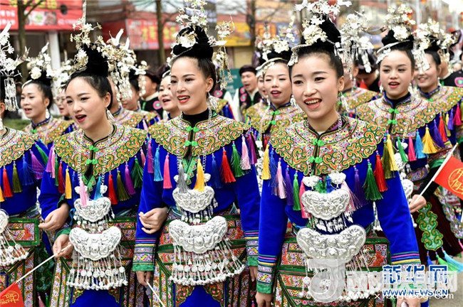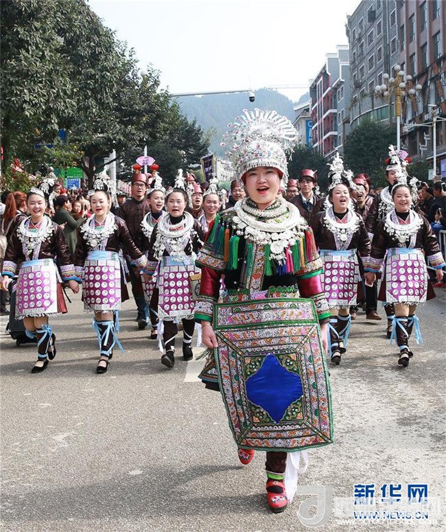 12月18日,身著盛裝的侗族同胞參加巡游。當(dāng)日,2017中國侗年暨第八屆黎平·中國侗文化旅游節(jié)“非遺”文化巡游在貴州省黔東南苗族侗族自治州黎平縣舉行,當(dāng)?shù)囟弊逋麣g聚一堂,喜迎侗年到來。(張暉 攝)