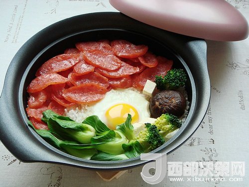 5.插電煮飯,無論什么電飯鍋,電壓力鍋,選擇煮飯功能就可。時間到,揭蓋,撒些青蒜葉。