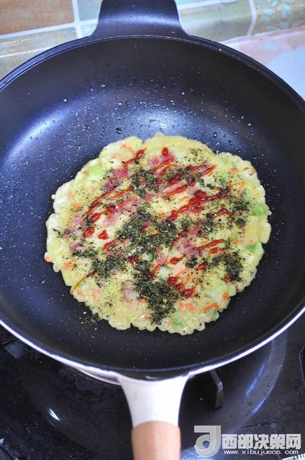 10.再把面餅翻過(guò)來(lái),擠上番茄醬,撒上海苔粉。