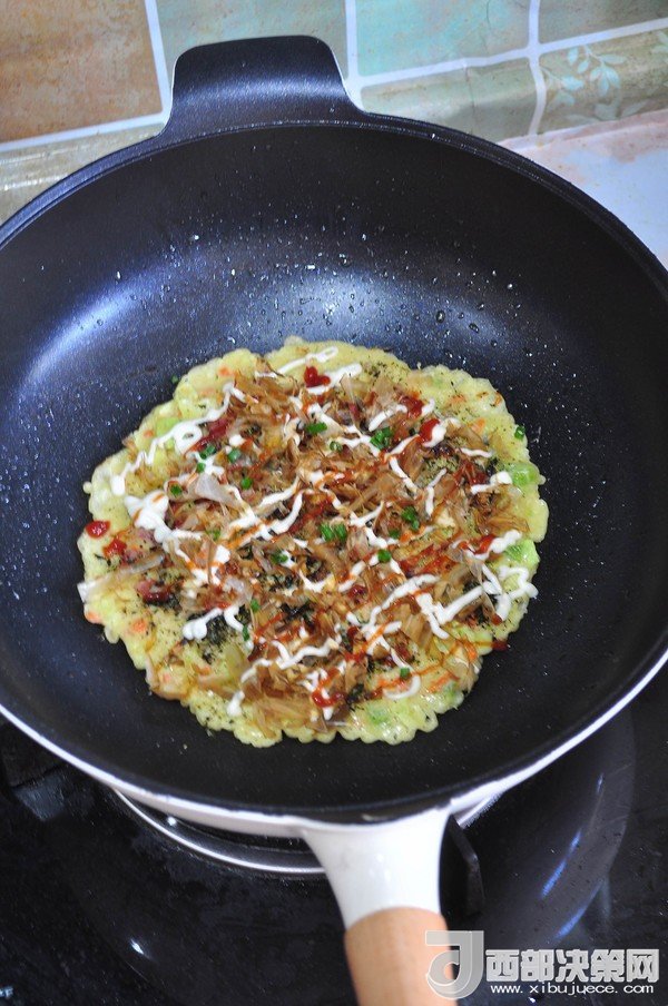 “大阪燒是一種日式蔬菜煎餅,有些地區(qū)根據(jù)日文漢字的寫(xiě)法,也叫做“御好燒”,為日本關(guān)西的一種民間美食,也是大阪飲食文化的代表。由于外觀(guān)的關(guān)系,也有人稱(chēng)大阪燒為“日本式比薩餅”,可以說(shuō)放上去的食材,并沒(méi)有特殊規(guī)定,一般是自己想吃什么就放什么。吃膩了中式的雞蛋薄餅,換個(gè)口味也別俱一格。做這個(gè)頂重要的是,一定要用不粘鍋,不然想翻面的時(shí)候,底部巴鍋底不動(dòng),而且還容易上面的沒(méi)熟,下面的已經(jīng)糊了。”