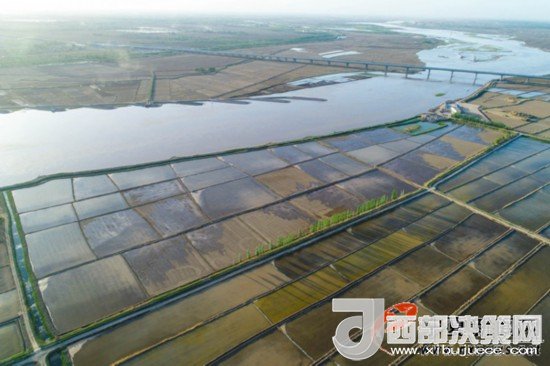 5月6日18時50分許,伴著落日金色的余暉,銀川市賀蘭縣黃河邊剛剛灌水的稻田波光粼粼,銀川平原引黃灌區(qū)稻田灌水,即將進入插秧季。 寧夏新聞網(wǎng)記者 祁瀛濤 攝