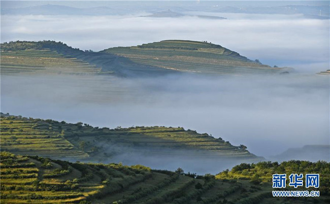 云霧繚繞的寧夏彭陽縣金雞坪梯田公園(7月17日攝)。新華社記者王鵬攝