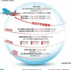 個(gè)體的表現(xiàn)匯聚成上半年四川外貿(mào)成績(jī)單:貨物貿(mào)易進(jìn)出口總值達(dá)3033億元,同比增長(zhǎng)21.9%,遠(yuǎn)高于同期全國(guó)3.9%的整體進(jìn)出口增幅。