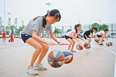 8月5日,南充小學(xué)生在操場(chǎng)上練習(xí)運(yùn)球。 本報(bào)記者 楊樹 攝