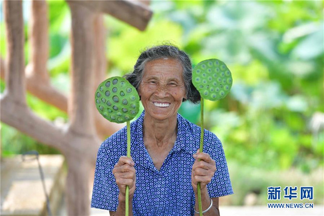 在廣西鹿寨縣中渡鎮(zhèn)大兆村,80歲的黃世秀老人在展示準備出售的蓮蓬(8月23日攝)。新華社記者 黃孝邦 攝