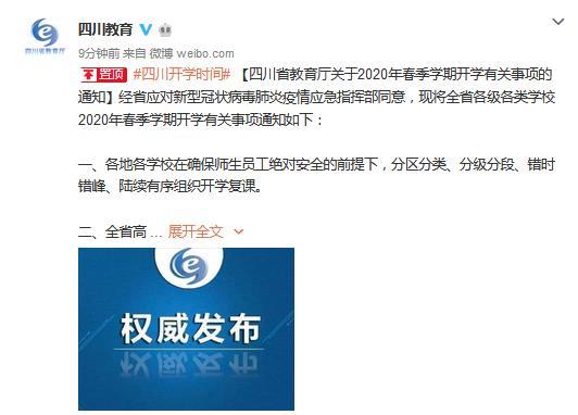《通知》稱,經(jīng)四川省應(yīng)對(duì)新型冠狀病毒肺炎疫情應(yīng)急指揮部同意,現(xiàn)將全省各級(jí)各類學(xué)校2020年春季學(xué)期開(kāi)學(xué)有關(guān)事項(xiàng)通知如下: