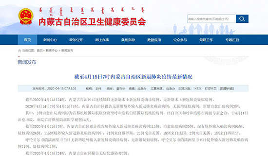 2020年4月14日7時至4月15日7時,內蒙古自治區(qū)報告無新增境外輸入新冠肺炎確診病例,無新增疑似病例,新增治愈出院病例3例。