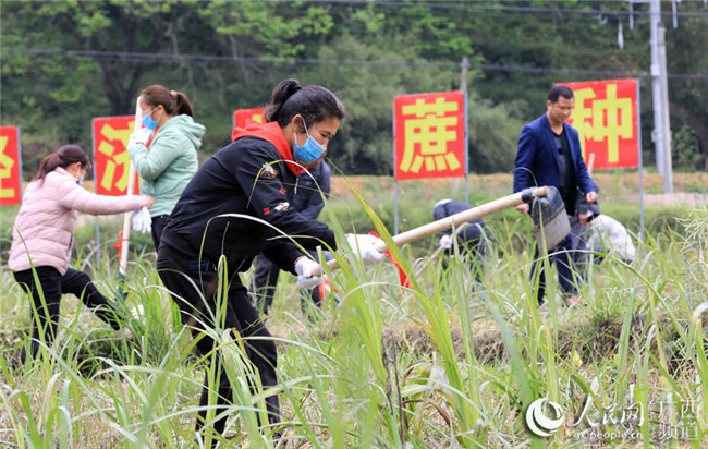 在廣西柳州市融安縣沙子鄉(xiāng)紅妙村,勞務(wù)隊(duì)成員在村集體經(jīng)濟(jì)甘蔗示范點(diǎn)勞作。譚凱興攝