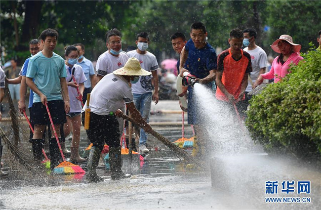 7月12日,融水苗族自治縣文化體育廣電和旅游局清淤小分隊在蘆笙廣場清理地面。 新華社記者 黃孝邦 攝