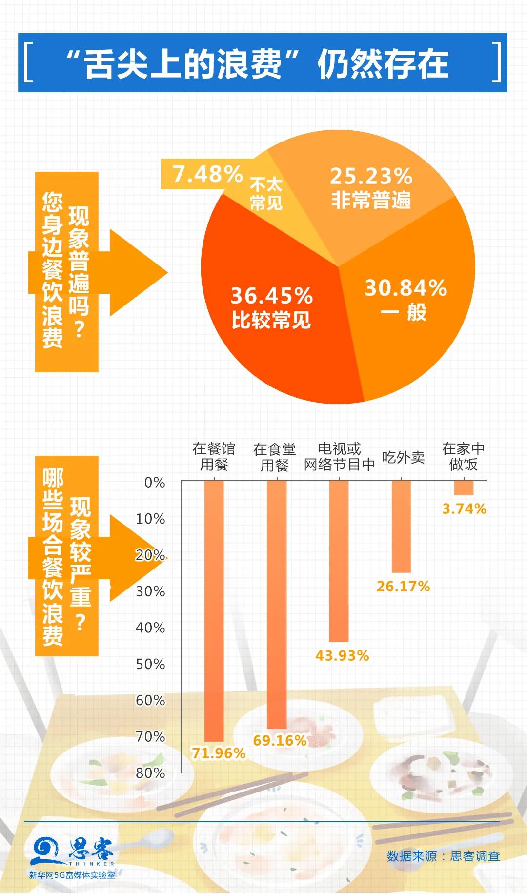 餐飲浪費現(xiàn)象觸目驚心,令人痛心!超過九成受訪者表示身邊存在不同程度的餐飲浪費現(xiàn)象。約七成受訪者認為在外用餐、在食堂就餐時浪費現(xiàn)象較嚴重。