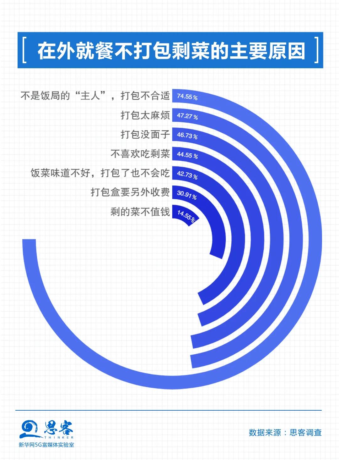 打包不合適、太麻煩、沒面子,這些是受訪者認為在外就餐不愿打包剩菜的主要原因。“我不是宴會的主辦者,我打包不合適,好像我占便宜似的”“同桌的人一起夾過的菜,打包不衛(wèi)生”“穿著西裝打著領帶,手上拿著打包盒很奇怪”“中午食堂的剩菜又沒有打包盒裝,下午又沒地方放,沒人會打包帶走”,這樣的受訪者留言在后臺還有不少。