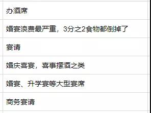 在調(diào)查問卷的后臺留言中,不少受訪者留言說,同學會、紅白宴、生日宴、升學宴、商務宴請等浪費量較高,甚至有人說“三分之二的食物都倒掉了”。