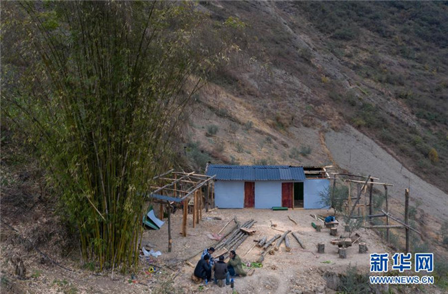 12月23日,某色蘇不惹和同伴在懸崖村修民宿(無人機照片)。新華社記者 江宏景 攝