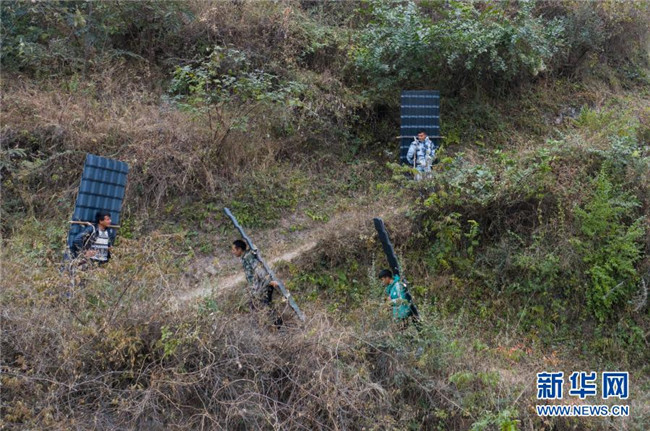 12月23日,某色蘇不惹(右一)和同伴背著修民宿的建材往村里走(無人機照片)。新華社記者 江宏景 攝