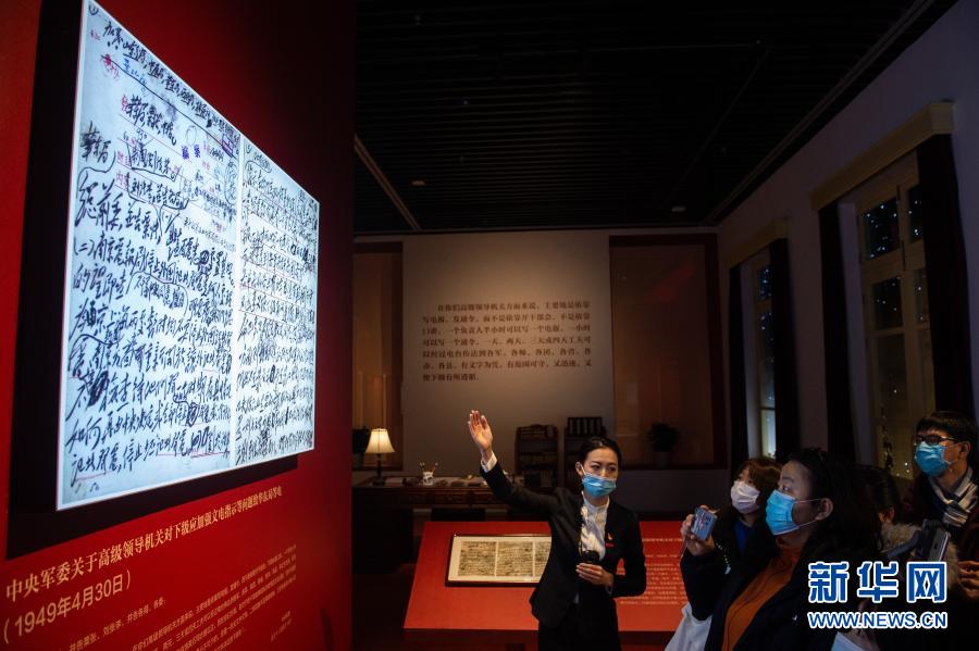 “毛澤東同志香山時(shí)期發(fā)布電報(bào)手稿專題展覽”在北京香山革命紀(jì)念館開展,講解員(左一)向媒體記者介紹電報(bào)內(nèi)容(2020年12月16日攝)。新華社記者 陳鐘昊 攝