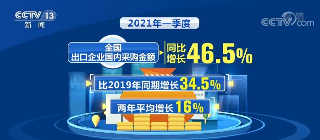 2021年一季度,海外需求復(fù)蘇繼續(xù)拉動我國出口快速增長,全國出口企業(yè)國內(nèi)采購金額同比增長46.5%,比2019年同期增長34.5%,兩年平均增長16%,年均增速高于全國平均水平2.9個百分點(diǎn)。