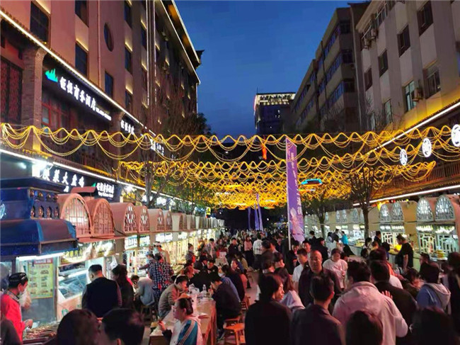 下午六七點,這里一百多個商戶支起攤位,羊蹄、羊雜碎、洋芋擦擦、洋芋沫沫、雜面等三十多種特色小吃冒著熱氣。街道人流如織,直到凌晨兩點依舊燈火通明。