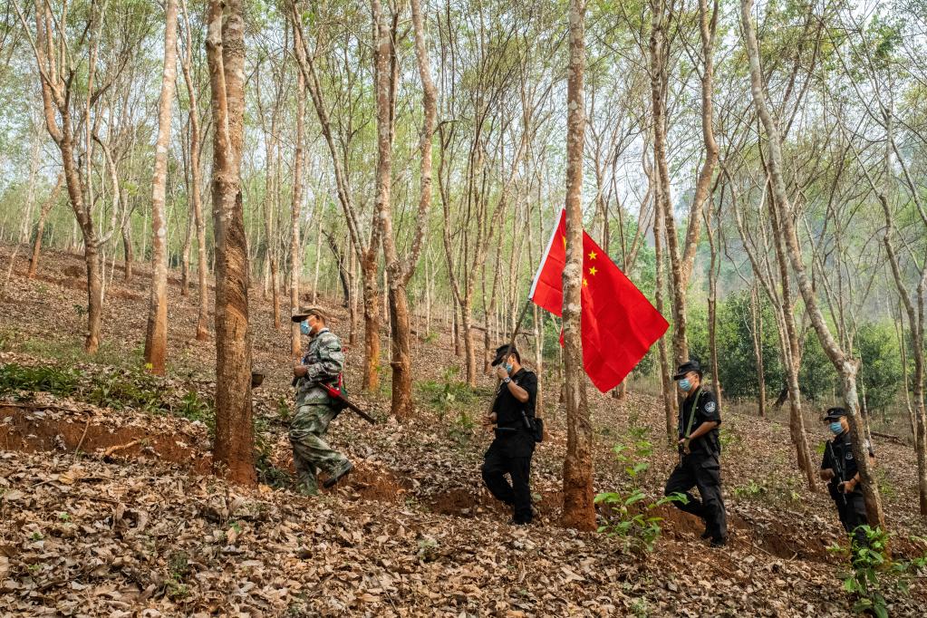 段二文(左一)和移民管理警察一起開展巡邊工作。新華社記者 嚴勇 攝