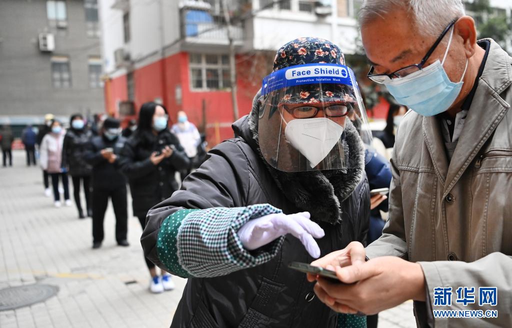 12月27日,志愿者李穎(前左)在社區(qū)核酸篩查現(xiàn)場(chǎng)協(xié)助居民出示健康碼。新華社記者 陶明 攝