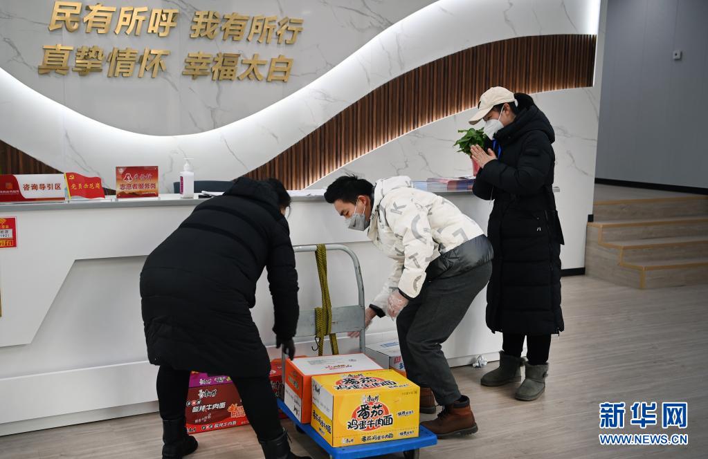 12月27日,社區(qū)居民(左)專(zhuān)門(mén)送來(lái)方便面等食品,慰問(wèn)志愿者們。新華社記者 陶明 攝