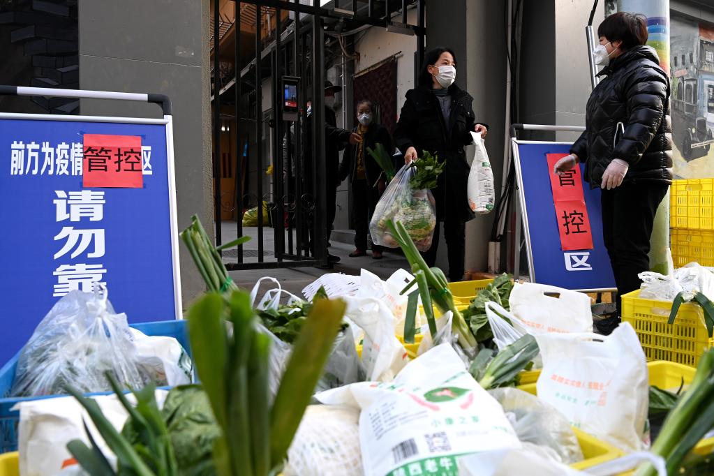 12月29日,在西安市新城區(qū)西一路街道通濟(jì)南坊一號院,居民在領(lǐng)取免費(fèi)生活物資。新華社記者 劉瀟 攝