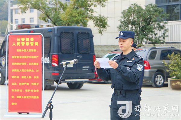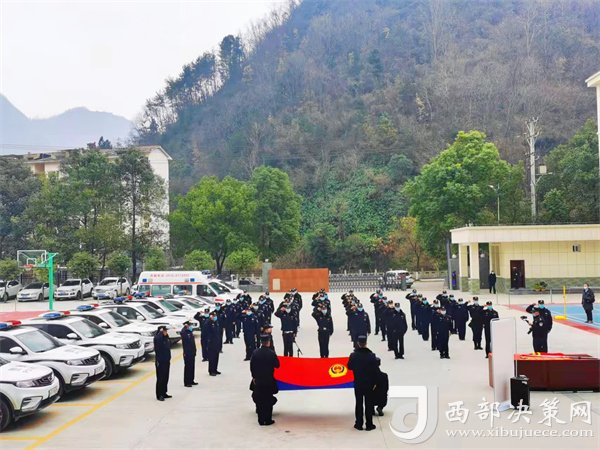 副縣長(zhǎng)、公安局黨委書記、局長(zhǎng)裴新民向鎮(zhèn)巴縣公安局黨員突擊隊(duì)授旗