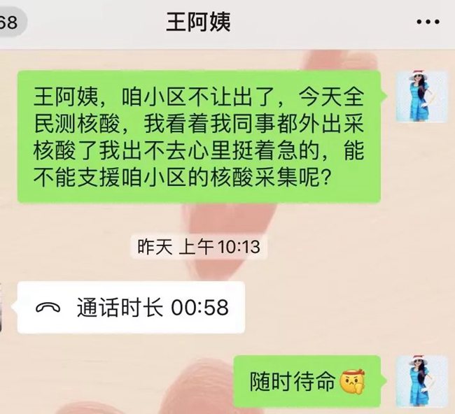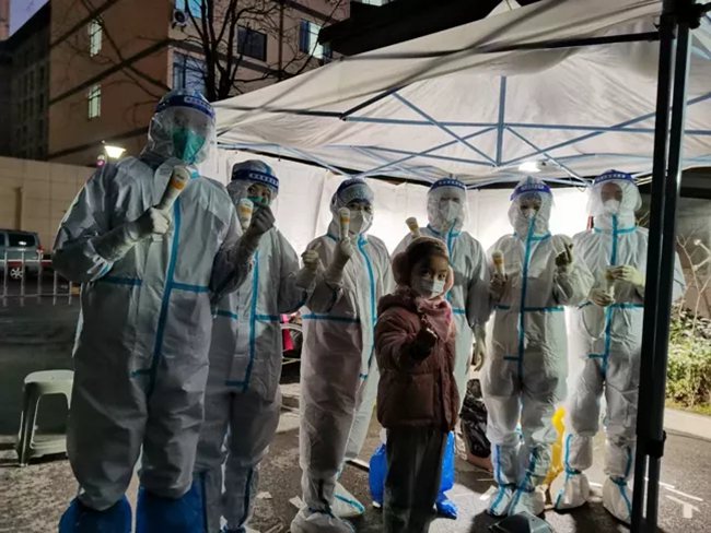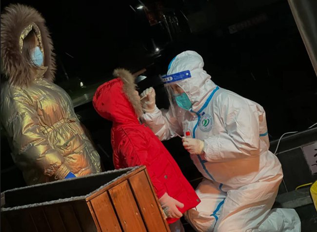 “姐姐,你冷不冷,你手疼不疼?”在排隊的隊伍中,一個小姑娘帶著哭腔問身著防護服的王航英。原來,王航英已經連續(xù)采集核酸近十個小時,換班時她脫下手套,想抽一張紙,結果雙手被凍得通紅,反復幾次都沒成功。