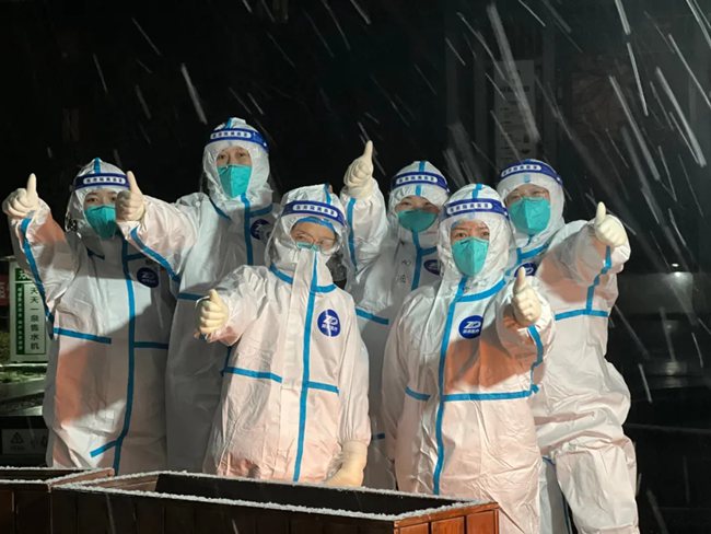 西安大興醫(yī)院的醫(yī)護人員在風雪中加油打氣。西安大興醫(yī)院供圖