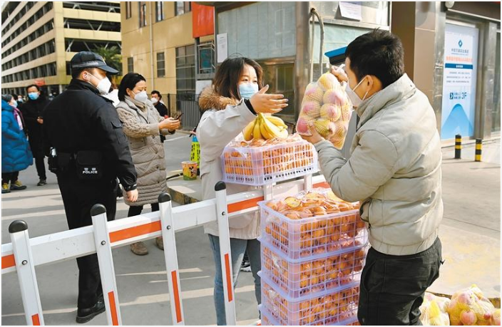 1月10日,一家便利店工作人員(右一)在為蓮湖區(qū)三民社區(qū)居民配送生活物資。 (新華社記者 陶明 攝)