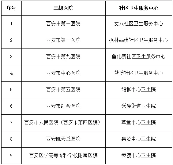 指定市屬三級醫(yī)院9家,對口支援高新區(qū)9個社區(qū)衛(wèi)生服務(wù)中心(或鄉(xiāng)鎮(zhèn)衛(wèi)生院,下同)(對口支援關(guān)系見附件),簽訂對口支援協(xié)議,下派內(nèi)科、外科、婦產(chǎn)科醫(yī)務(wù)人員駐點(diǎn)社區(qū)衛(wèi)生服務(wù)中心坐診,另外由西安市兒童醫(yī)院、西安市中醫(yī)醫(yī)院向丈八社區(qū)衛(wèi)生服務(wù)中心、楓林綠洲社區(qū)衛(wèi)生服務(wù)中心、魚化寨社區(qū)衛(wèi)生服務(wù)中心、藍(lán)博社區(qū)衛(wèi)生服務(wù)中心派中醫(yī)醫(yī)師和兒科醫(yī)師,確保社區(qū)衛(wèi)生服務(wù)中心能順利開展基本診療工作。高新區(qū)要加強(qiáng)社區(qū)衛(wèi)生服務(wù)中心硬件建設(shè),配備必要的檢查、檢驗(yàn)設(shè)備,確保能夠完成基本醫(yī)療所必需的檢查和檢驗(yàn)項(xiàng)目。支援醫(yī)院與社區(qū)衛(wèi)生服務(wù)中心建立上下轉(zhuǎn)診關(guān)系,對超出社區(qū)衛(wèi)生服務(wù)中心診療能力的轉(zhuǎn)往上級醫(yī)院進(jìn)一步診治,支援醫(yī)院應(yīng)采取預(yù)約門診、綠色通道或預(yù)留床位等方式做好支持。
