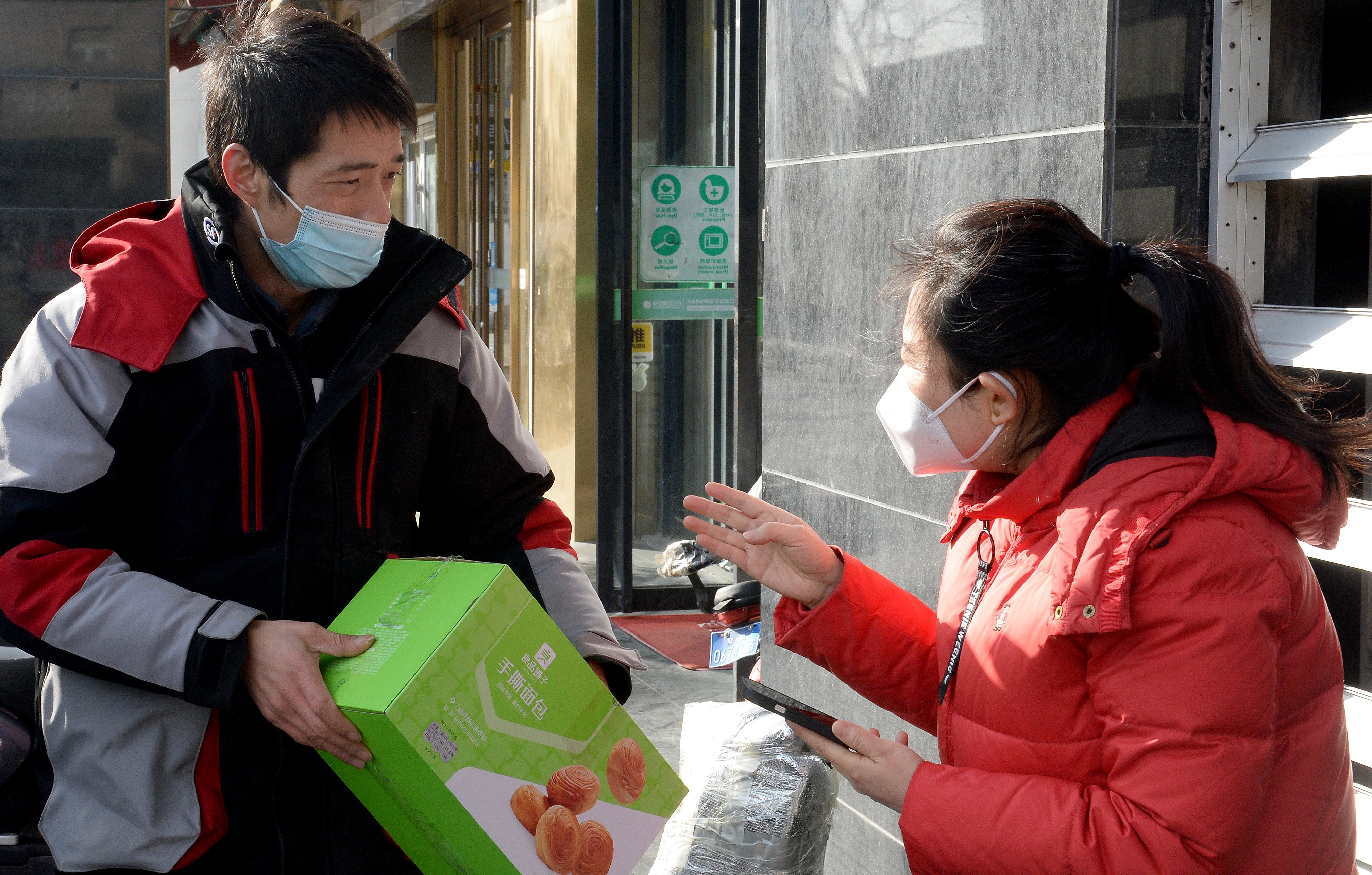 1月13日,中國郵政西安經(jīng)開分公司的快遞員(右)在一小區(qū)派送快件,社區(qū)志愿者對快遞外包裝進(jìn)行消殺。新華社發(fā)(鄒競一 攝)