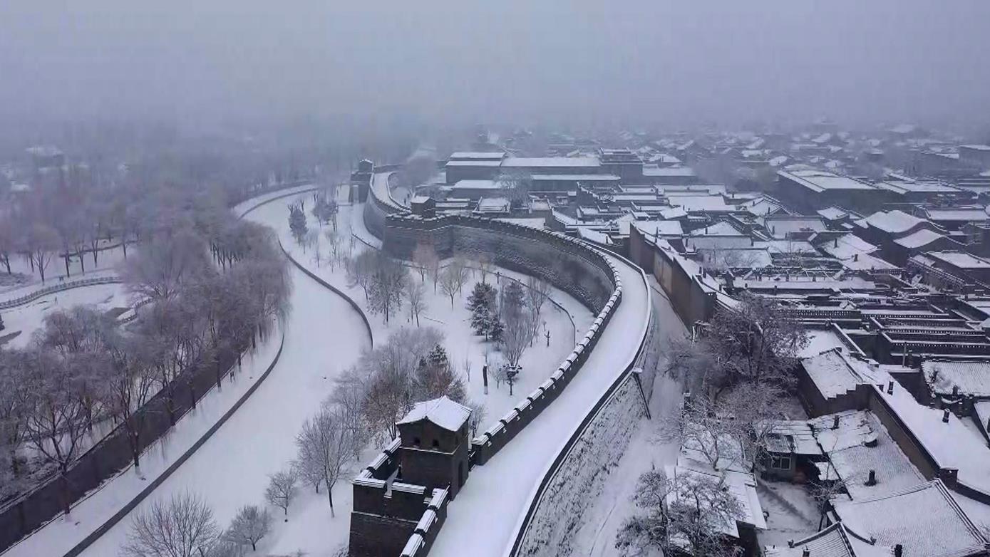 △2022年1月24日,平遙迎來降雪天氣,整個古城的輪廓被銀白筆墨勾勒出來。(總臺央視記者 范凱拍攝)