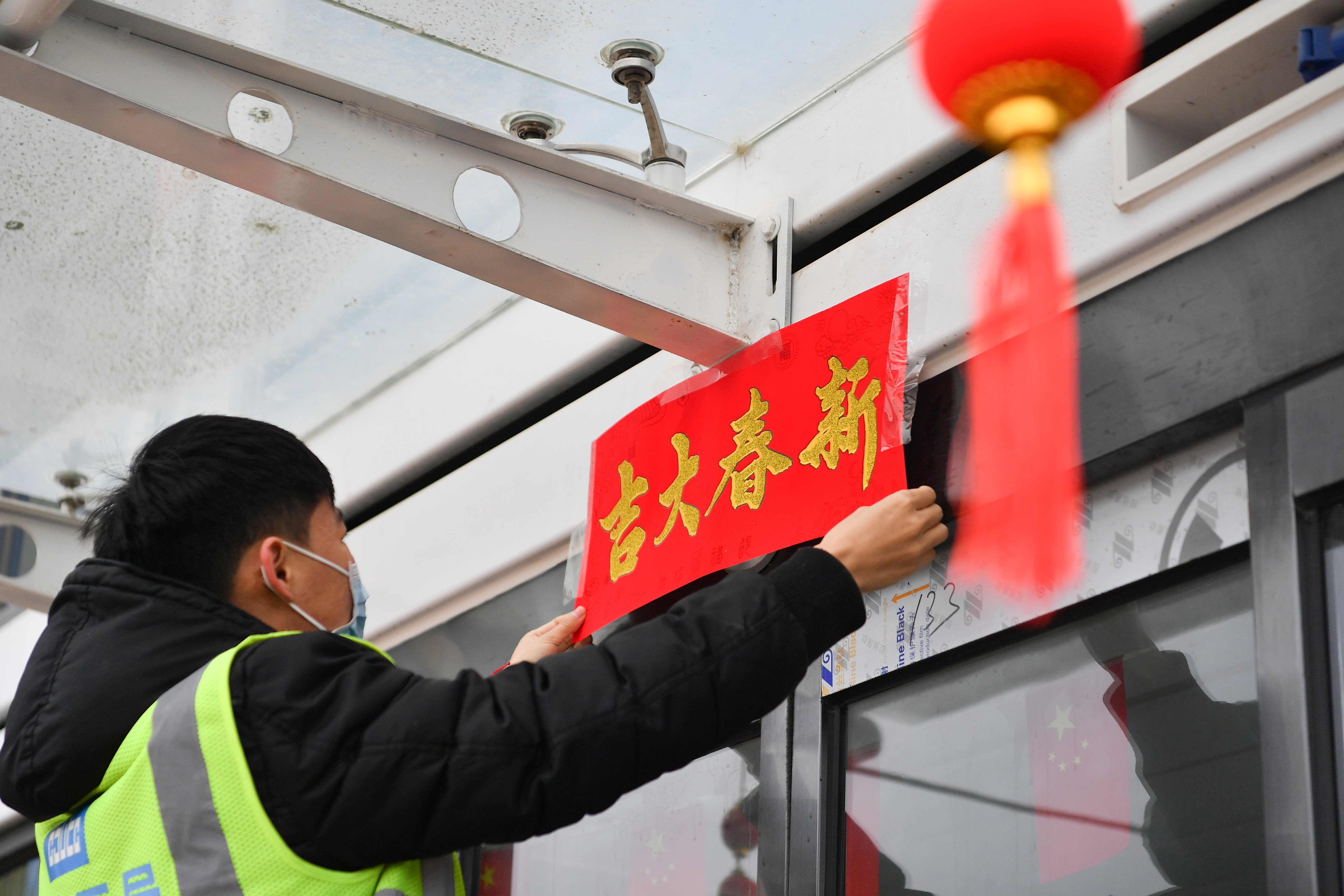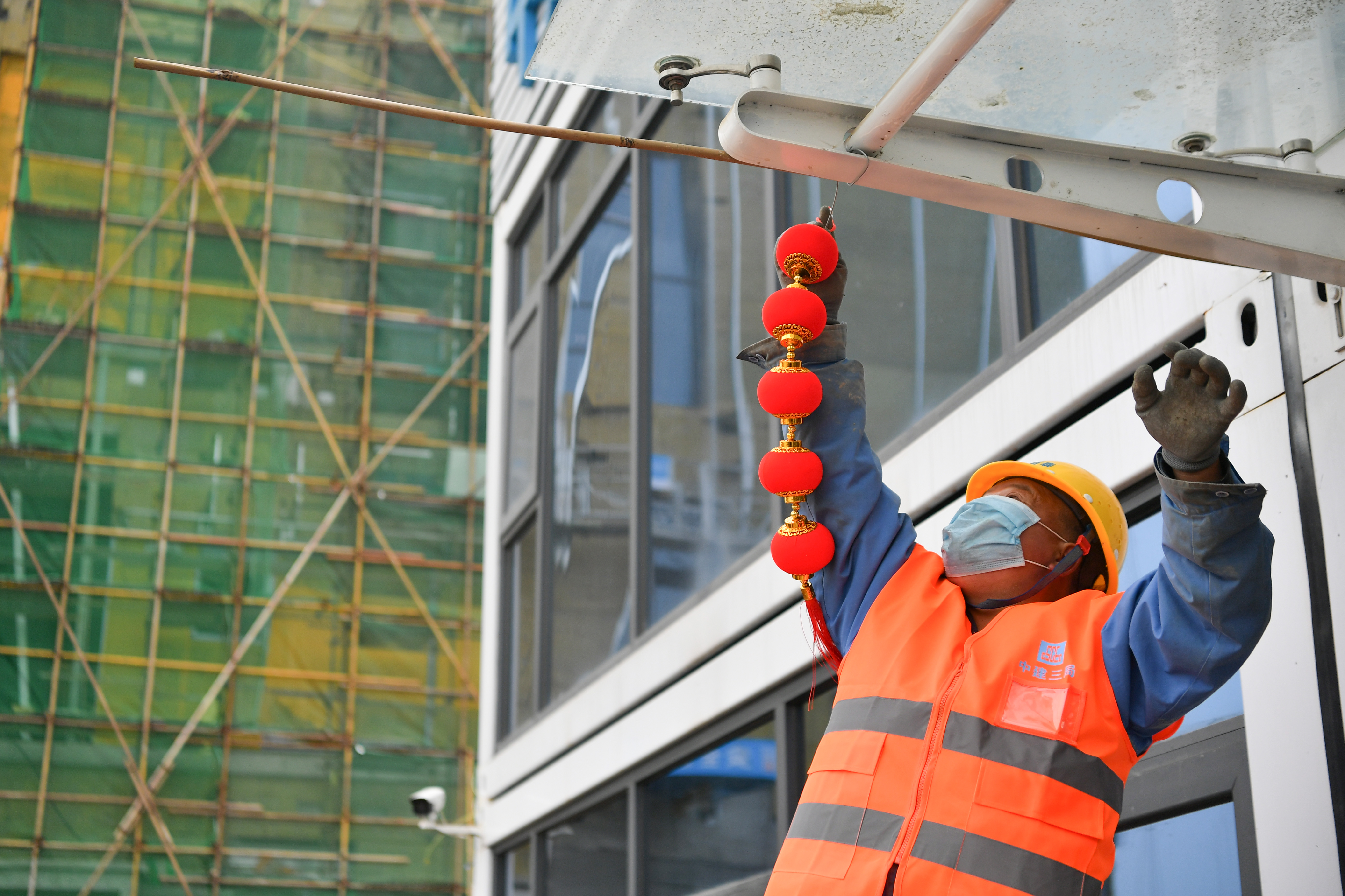 當日是農歷臘月二十八,在陜西省西安市第一實驗學校建設項目工地,留守工地的建設者用貼春聯(lián)、掛燈籠等方式,迎接佳節(jié)的到來。