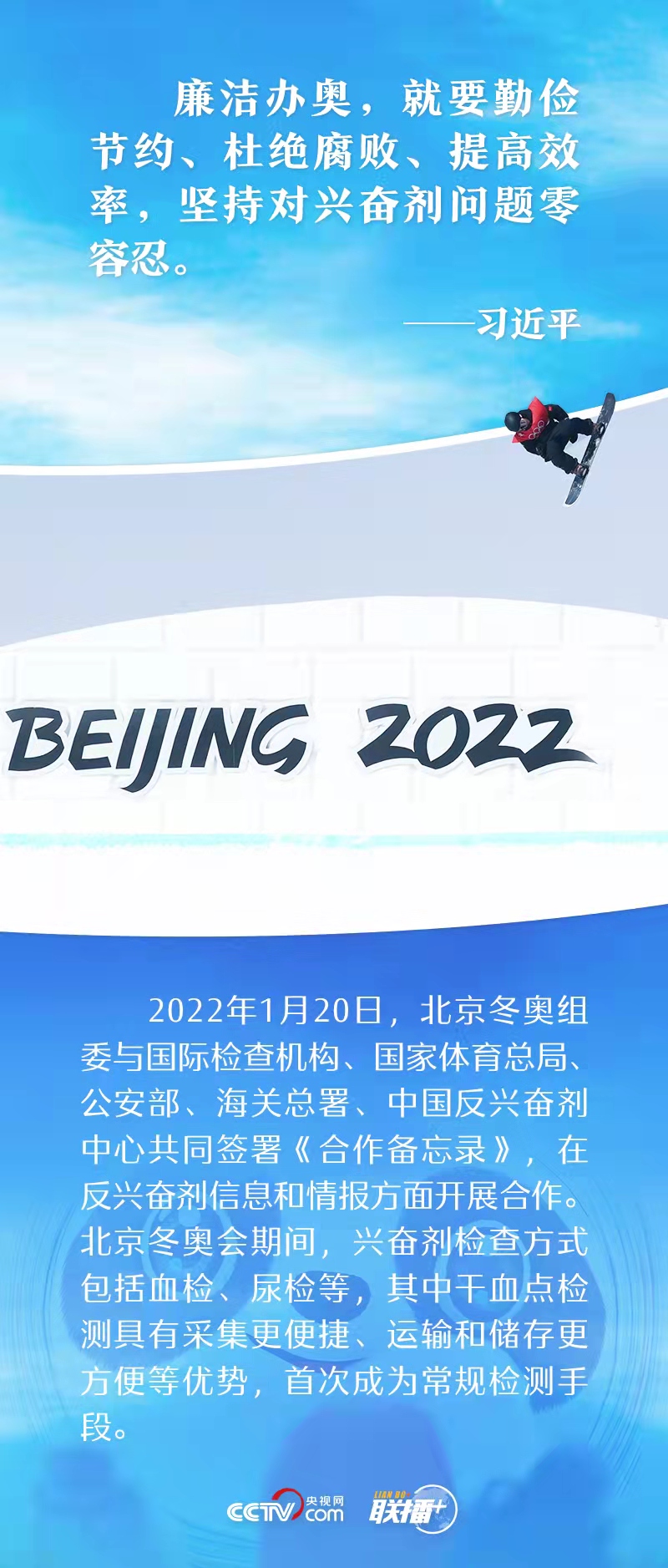 “能借不租,能租不買”極大地節(jié)省了物資采購成本;整合需求、減少流轉(zhuǎn)環(huán)節(jié),最大限度壓縮權(quán)力尋租空間,提高廉潔透明度;堅持對興奮劑問題零容忍......廉潔辦奧理念貫穿于北京冬奧會籌備、運(yùn)行的各個方面。那么,這些具體措施都是如何落實(shí)的呢?央視網(wǎng)《聯(lián)播+》帶您一起了解。