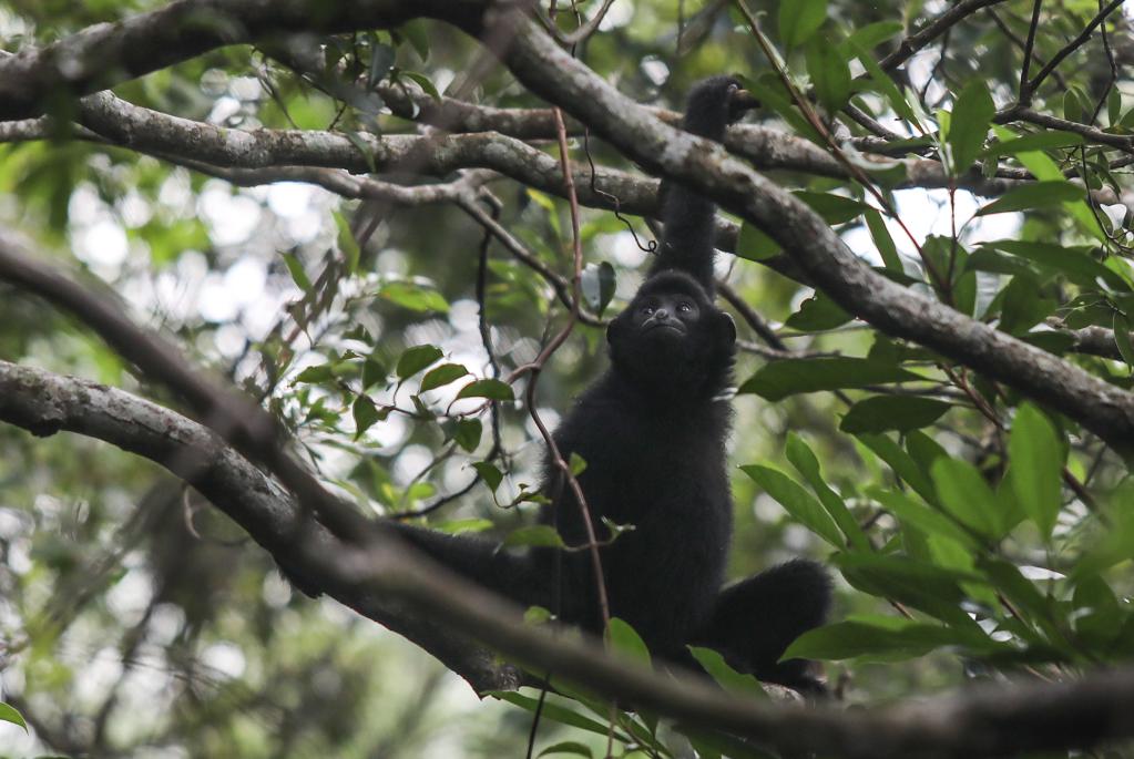 這是在海南霸王嶺自然保護(hù)區(qū)內(nèi)拍攝的海南長(zhǎng)臂猿(2019年10月25日拍攝)。新華社記者 蒲曉旭 攝