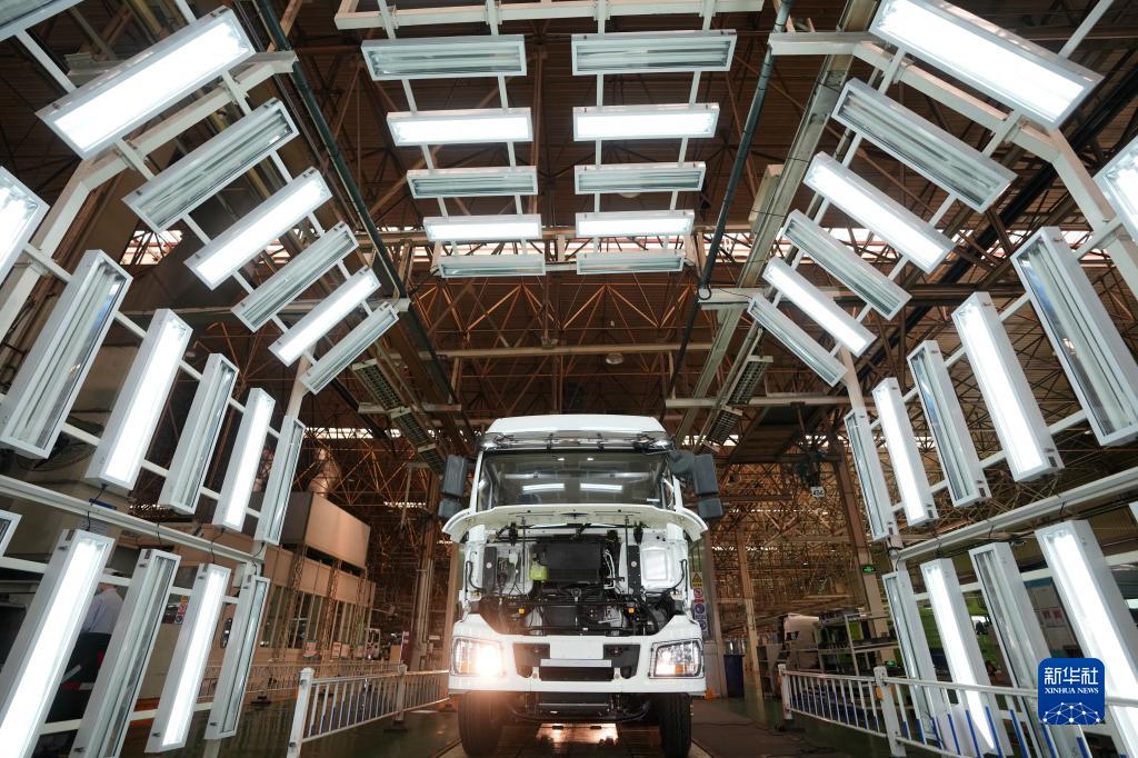 5月24日,在陜西汽車控股集團有限公司總裝車間,一輛裝配完畢的陜汽重型卡車等待驗收。 新華社記者 李一博 攝