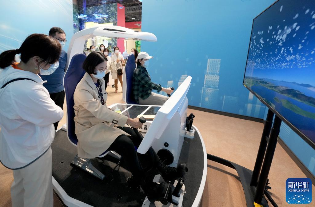 10月7日,觀眾在“奮進(jìn)新時代”主題成就展上體驗(yàn)操縱直升機(jī)訓(xùn)練模擬器。當(dāng)日是國慶長假的最后一天,大批觀眾來到北京展覽館參觀“奮進(jìn)新時代”主題成就展。新華社記者王毓國 攝
