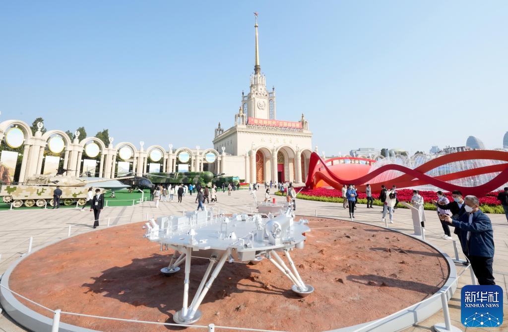10月7日,觀眾在“奮進(jìn)新時代”主題成就展上參觀天問一號著陸器模型。當(dāng)日是國慶長假的最后一天,大批觀眾來到北京展覽館參觀“奮進(jìn)新時代”主題成就展。新華社記者王毓國 攝