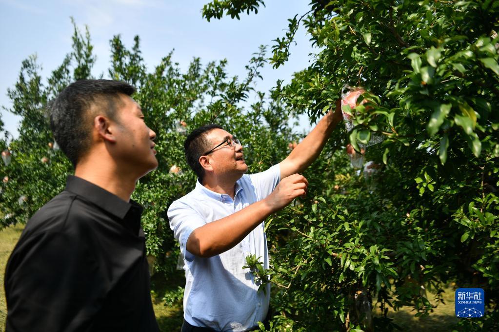 陜西省西安市臨潼區(qū)園藝工作站工作人員(右)與當?shù)厥穹N植大戶交流果品長勢(2022年9月26日攝)。新華社記者 張博文 攝